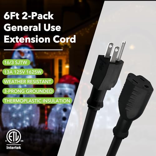 CONVENIENT LENGTH: The 6ft extension cord 3 prong design offers just the right length for most outdoor tasks, ensuring you have the reach you need without excess cord clutter, all in a convenient 2-pack.
